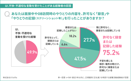 - 求職者の49.9%が、面接・OB訪問等で「明確なセクハラ/セクハラか判断に迷うが、不快・不適切な言動」を受けた- 求職者全体の41.2%、また「明確なセクハラ/不快・不適切な言動」を受けたと回答した人の75.2%が、面接・OB訪問時に許可なく録音または記録したことがある