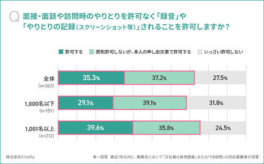 - 求職者による無断録音・記録の扱いは、「原則許可しないが申し出次第で許可」37.2%、「許可する」35.3%、「いっさい許可しない」27.5%と企業で分かれる