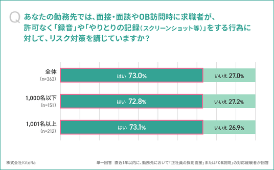 - 企業の73.0%が、求職者による「許可なく録音/記録」に対するリスク対策を講じている