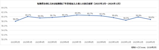 転職後に「年収増加」した個人の割合は、58.8 %(前月差:-1.1ポイント)でした。