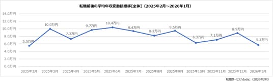 パーソルキャリア株式会社が運営する転職サービス「doda(デューダ)」(編集長:桜井 貴史)は、dodaエージェントサービスを利用して2026年1月に転職決定した個人の、転職前後の平均年収変動額と年収変動割合を発表いたします。