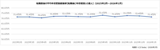 転職後に「年収増加」した個人の年収は、平均で71.4万円(前月差:-1.0万円)増加しました。