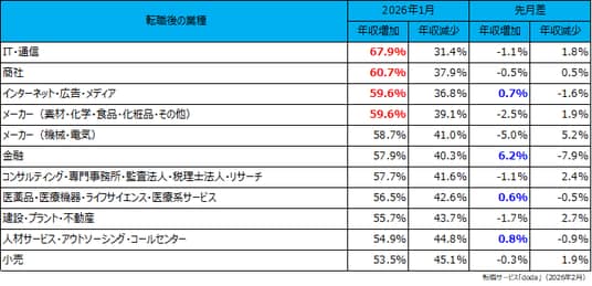 転職後に年収増加した個人が多かった業種は、「IT・通信」(67.9%)、次いで「商社」(60.7%)、そして「インターネット・広告・メディア」と「メーカー(素材・化学・食品・化粧品・その他)」(59.6%)が続きました。