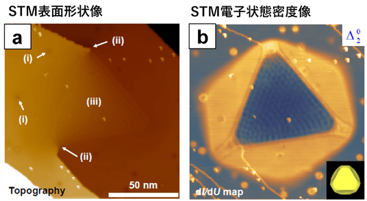 今回の研究では、古くから超電導物質として知られる「鉛(Pb)」を、43 mK (ミリケルビン:マイナス273.11℃相当) の超低温まで冷やすことで、極めて高いエネルギー分解能を有するSTM電子分光マッピングを実施しました。その結果、鉛のもつ二つの超電導バンドの判別に成功し、この鉛の表面で「積層欠陥四面体(SFT)」を観察しました。
