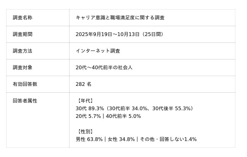 本調査は、2025年9月19日から10月13日にかけて、20代から40代前半の社会人282名を対象に実施したもので、現代の働く世代のキャリア意識と職場環境に対する満足度の実態を明らかにしました。