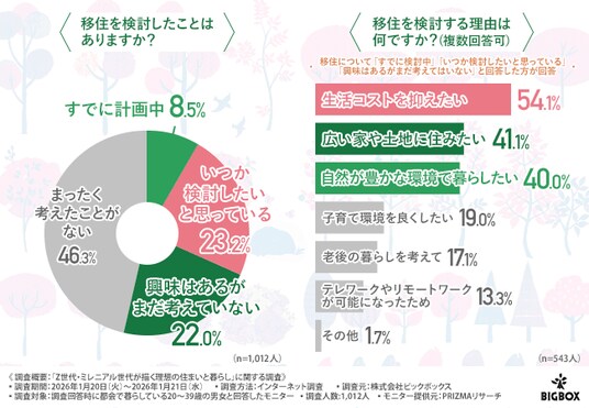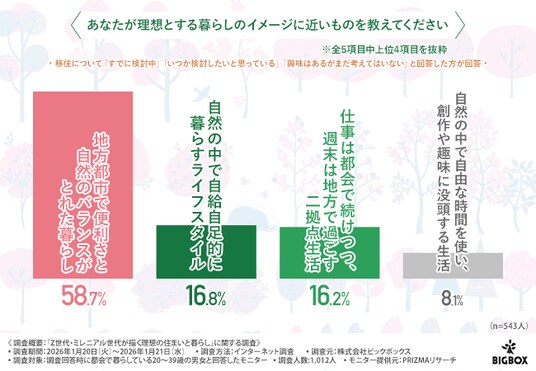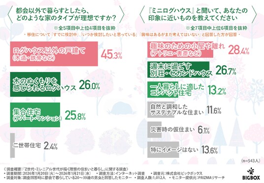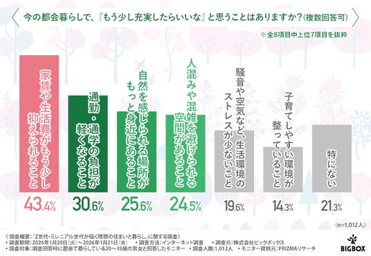 株式会社ビックボックス(所在地:栃木県宇都宮市、代表取締役:手塚 大介)は、都会で暮らしている20~39歳の男女を対象に、「Z世代・ミレニアル世代が描く理想の住まいと暮らし」に関する調査を行いました。