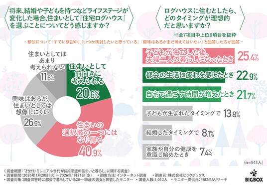 「将来、結婚や子どもを持つなどライフステージが変化した場合、住まいとして『住宅ログハウス』を選ぶことについてどう感じるか」と尋ねたところ、約6割が『住まいとして前向きに考えられる(20.6%)』『住まいの選択肢の一つにはなり得る(40.9%)』と回答しました。