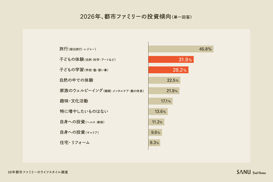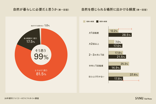 「Live with nature. / 自然と共に生きる。」を掲げる株式会社SANUは、関東圏の子育て世帯627名およびSANU 2nd Home利用者188名を対象に「都市ファミリーのライフスタイル調査」を実施しました。