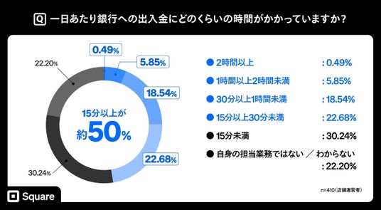 調査の結果、レジ締めに15分以上かかると回答した事業者は39%、銀行での入出金に15分以上か かる 事業者が48%に上りました。これらを合計すると、現金管理に1日あたり30分以上を要して いると推計されます。1日30分と仮定して試 算すると、月間では約15時間(30分×30日)に相当します。東京都の最低賃金(1,226円)で換算すると、月 あたり1万8,390円以上の人件費負担となります。