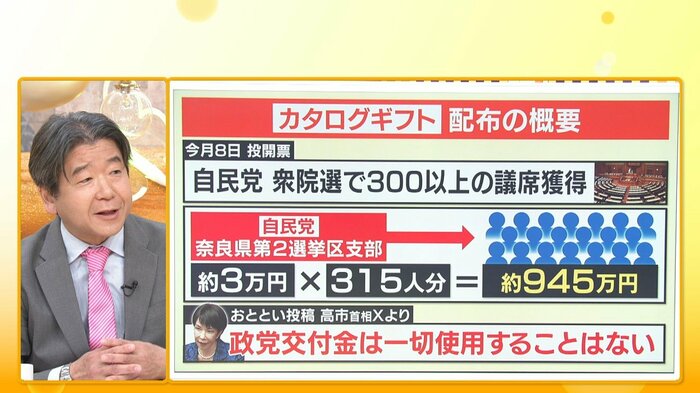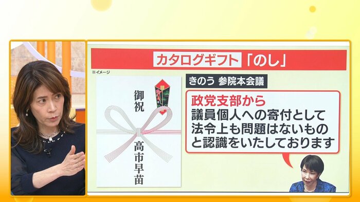 ひとつは、高市さんはおそらく法制局に聞いて、法律に抵触していないような答弁を考えた、だから(送り主は)自分ではない、選挙区支部から送った物だということにしている。しかも、金銭でもない有価証券でもない、カタログギフトだということにしたとなっていますが、私はそれで本当にねぎらいの気持ちになっているのか。あとは、これが本当に政治活動なのかという所には少し議論があると思います。