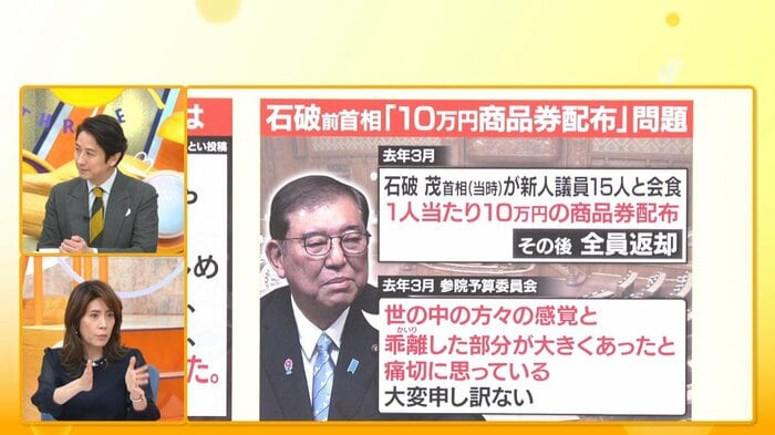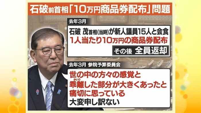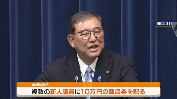 “多くの議員へのプレゼント”で思い出されるのは、2025年に複数の新人議員に10万円の商品券を配ったとして、石破茂前首相が批判を受けて謝罪をした件。