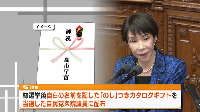 25日、参議院本会議で行われた代表質問で、野党側から追及されたのは、高市早苗首相が総選挙後、自らの名前を記した「のし」付きの“カタログギフト”を、自身をのぞく今回の衆院選で当選した全ての自民党議員に配布した事柄についてです。