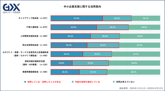 また、全体的に補助金よりも助成金の方が、活用意向がやや高い傾向でした。補助金が国や自治体の政策に沿った事業に対して行われる、事業性が強い支援であるのに対し、助成金は主に雇用や労働環境に重点を置いているため、そうした支援内容の性質の違いがこの結果に表れている可能性があります。