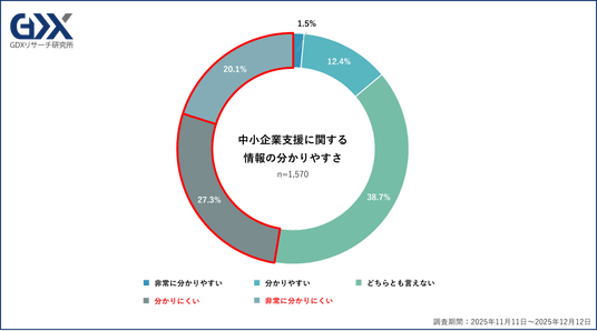 実際に中小企業の経営者に中小企業支援に関する情報(補助金・助成金等)の分かりやすさについて問うと、「非常に分かりやすい」と回答した企業はわずか1.5%であり、「分かりやすい」の12.4%と合わせても13.9%にとどまる結果となりました。一方、「非常に分かりにくい」の20.1%、「分かりにくい」の27.3%の合計は47.4%と約5割の企業が支援制度についての情報について分かりにくいと感じていることが明らかになりました。