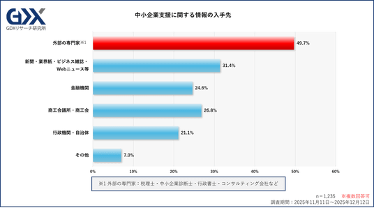また、そうした中小企業支援に関する情報の入手先について問うと、「外部の専門家(税理士・中小企業診断士・行政書士・コンサルティング会社など)」が49.7%で最も多く、2番目に多い「新聞・業界紙・ビジネス雑誌・Webニュース等」の31.4%とは大きく差が開く結果となりました。