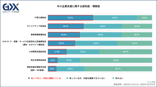 具体的な支援ごとに見ても、内容まで理解されている補助金・助成金は一部に限られており、代表的な制度であるIT導入補助金でさえ内容を理解している企業は半数に満たないことがわかります。