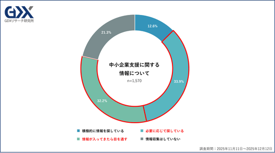 本レポートでは、中小企業支援に関する情報(補助金・助成金等)の入手先や認知状況、活用意向などに関して調査しました。自ら積極的に情報を探している中小企業は12.6%にとどまり、多くの企業は必要に応じて、または情報が入ってきたら目を通す程度の意識であるという結果になりました。