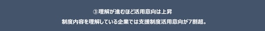 こうした中小企業支援に関する情報については、約半数の企業が分かりにくいと感じていること、一方で支援内容について認知し、理解している企業の場合、活用意向が高いこともわかりました。