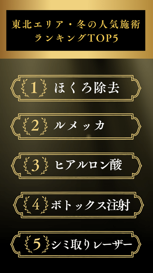 今回のランキングでは、肌治療関連の施術が多数ランクインしました。東北エリアは冬季の日照時間が短く紫外線量も少ないため、シミ・くすみ治療を本格的に進める時期として適しています。