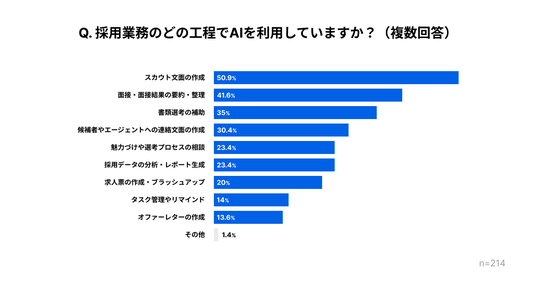 また、活用シーンで最も多いのは「スカウト文面の作成」で50.9%でした。次いで「面接・面接結果の要約・整理」が41.6%、「書類選考の補助」が35.0%、「候補者やエージェントへの連絡文面の作成」が30.4%でした。定型文のような汎用的な情報より、選考や候補者そのものに関わる機微情報を扱う業務で、とくにAI活用が進んでいることが伺えます。