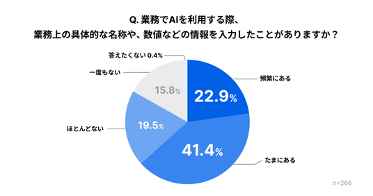 業務でAIを利用する際、業務上の具体的な名称や、数値などの情報を入力したことがあるか聞いたところ、22.9%が「頻繁にある」、41.4%が「たまにある」と回答しました。「ほとんどない」19.5%を合わせると、業務でAIを利用している人のうち、8割強が業務で機密情報をAIツールに入力したことがあるという結果になりました。