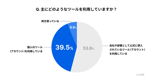 利用しているツールについて聞いたところ、53.8%が「会社や部署として公式に導入されているツール(アカウント)を利用している」と回答した一方、39.5%が「個人のツールを使っている」、6.8%が「両方使っている」と回答し、業務でAIを利用している人の約半数が、個人のツールを利用している、いわゆる「シャドーAI」であることがわかりました。