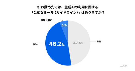 AI利用に関する「公式なルール」の有無について聞いたところ、46.2%が「ない」、6.5%が「わからない」と回答しました。会社としてルールが定まっていない、あるいはルールを知らない中でAIを利用しているケースがあることが浮き彫りになりました。