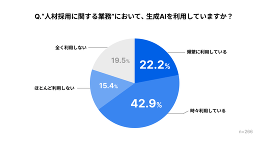 採用業務におけるAIの利用状況を聞いたところ、22.2%が「頻繁に利用している」、42.9%が「時々利用している」と回答しました。
