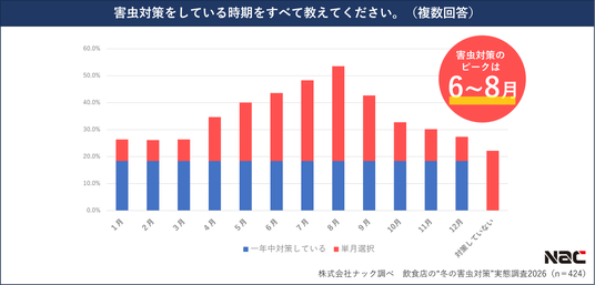害虫対策をしている時期を聞いたところ、実施率40%を超えたのが5~9月、中でも夏本番の8月は50%以上の飲食店が対策を実施していることが分かりました。一方、12月~3月に害虫対策をする飲食店は30%以下に留まり、害虫が表に出てくる春夏のみ対策している飲食店が多いことが明らかになりました。