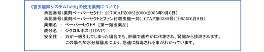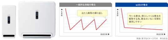 ■定期稼働で年中対策!業務用害虫駆除器のご紹介厚生労働省の承認を得た国内初※の医薬品『with』は、ゴキブリの特性を考え、毎週2回、6時間の稼働を自動的に繰り返す独自の駆除システムを採用。オートタイマーを設定すれば、閉店後の無人の時間帯に自動で薬剤を散布できるため、飲食店経営者・店舗責任者の方々の手間を増やすことなく対策が可能です。