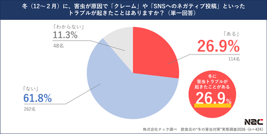 冬に害虫が原因で「クレーム」や「SNSへのネガティブ投稿」などのトラブルを経験したことがあるか聞いたところ、26.9%が「ある」と回答しました。Q2では「(冬は)虫が少ない季節だと思う」との回答が多かったものの、実際は冬でも害虫被害にあっている飲食店が一定数いることが明らかになりました。