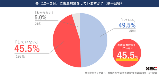 冬(12~2月)に自身の店舗で害虫対策をしているかどうか聞いたところ、「している」と回答した飲食店は49.5%、「していない」と答えた飲食店は45.5%となり、約半数の飲食店が冬は害虫対策をしていないことが明らかになりました。