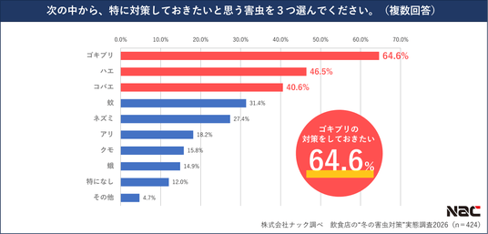 業務用の害虫駆除システム「with(ウィズ)」を展開する株式会社ナック(本社:東京都新宿区、代表取締役社長:吉村 寛)は、多くの害虫が冬ごもりから目覚め始める3月を目前に、全国の飲食店経営者・飲食店の店舗責任者424名を対象に「飲食店の“冬の害虫対策”実態調査2026」を実施しました。