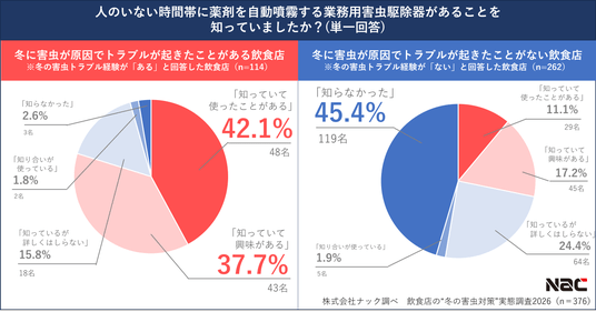 「人のいない時間帯に薬剤を自動噴霧する業務用害虫駆除器」を知っていたか聞いたところ、冬の害虫トラブル経験がある飲食店の79.8%が「知っていて使ったことがある」「知っていて興味がある」と回答。一方、冬の害虫トラブル経験がない飲食店の45.4%が「知らなかった」と回答しました。