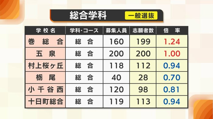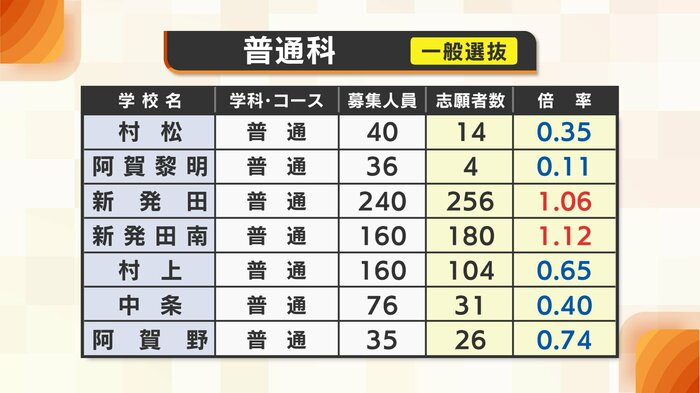 公立高校の一般入試は、80校・105学科で行われ、募集人数は1万2540人。全日制の平均倍率は0.99倍で、全日制・定時制を合わせた平均倍率は0.97倍となっている。