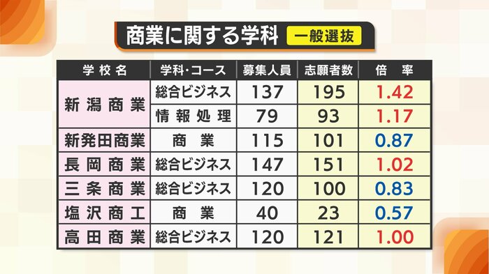 新潟商業の総合ビジネスが1.42倍、情報処理が1.17倍と1倍を上回っている。