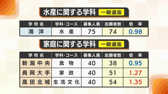 長岡大手の家政と高田北城の生活文化が1倍を上回った一方で、新潟中央の食物は定員割れとなった。