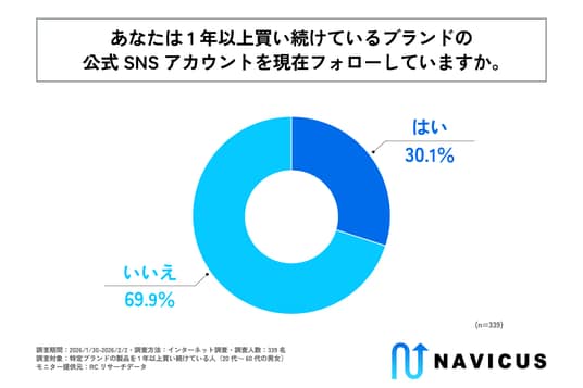続いて、「自身は1年以上買い続けているブランドの公式SNSアカウントを現在フォローしているか」を尋ねる設問への回答では、「いいえ」が69.9%、「はい」が30.1%という結果になりました。この結果から、特定ブランドの製品を1年以上買い続けている人の約3人に1人が、そのブランドの公式SNSアカウントを現在フォローしていることが判明しました。