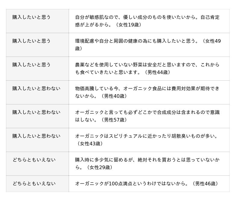 オーガニック商品の利用状況や選びたい場面、自由記述にて購入したい理由などについて聞いています。調査結果をお知らせいたします。