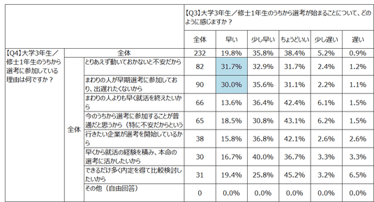 Q3選考開始時期への感じ方とQ4参加理由をクロス集計したところ、選考時期を「早い」と感じている学生は、「まわりの人が早期選考に参加しており、出遅れたくないから」「とりあえず動いておかないと不安だから」といった理由で選考に参加している傾向が見られ、不安に駆られて就活を始めている実態が浮き彫りになりました。