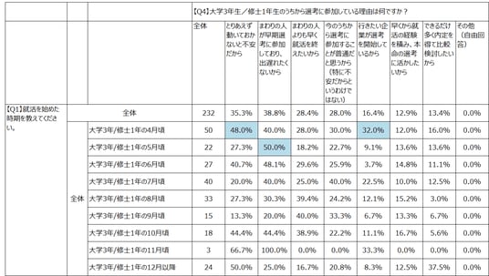 さらに、Q1就活開始時期とQ4参加理由をクロス集計したところ、大学3年/修士1年の4月という最も早い時期に就活を始めた学生ほど、「とりあえず動いておかないと不安だから」という理由が48.0%と顕著に高いことが明らかになりました。この結果は、全体平均の35.3%を大きく上回っています。また、次いで早い5月に就活を始めた学生の半数の50.0%は、「まわりの人が早期選考に参加しており、出遅れたくないから」という回答でした。