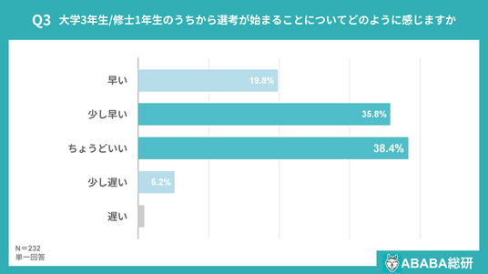 一方で「ちょうどいい」も38.4%に達し、早期化を受け入れる学生も4割近くに。