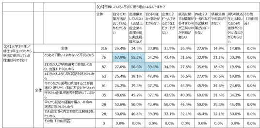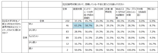 また、Q3選考開始時期への感じ方とQ5苦戦している対策内容をクロス集計したところ、選考時期を「早い」と感じている学生ほど、選考対策全般で苦戦している傾向が明らかになりました。