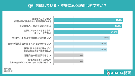 また、「Webテスト・SPIなどの試験対策がおぼつかない」が27.8%、「自分の対策方法が合っているかわからない」と「就活に関する情報が多すぎて何が正解なのか判断が難しい」がそれぞれ26.4%となり、情報過多の中で正しい対策方法を見極めることに悩んでいる学生も約4人に1人に達しています。