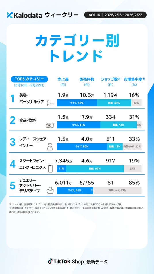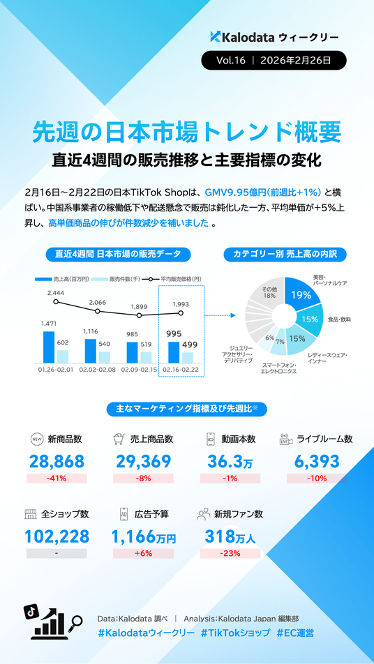 2月16日~2月22日の日本TikTok Shopは、GMV9.95億円(前週比+1%)と横ばいで推移しました。