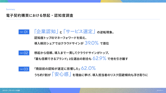 想起は「名前が出る」段階に過ぎませんが、電子契約のような法的証拠を扱うカテゴリーでは、その後の信頼の深さが勝敗を分けます。クラウドサインは、想起された瞬間に「ここなら安心だ」という圧倒的な本命感を抱かせることに成功しており、それがコンペにおける強さの源泉となっています。