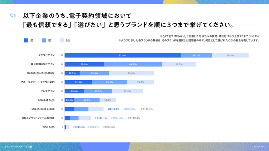 「Q6. Q1で全て「知らない」以外を回答した方にお聞きします。以下企業のうち、電子契約領域において「最も信頼できる」「選びたい」と思うブランドを順に3つまで挙げてください(順位付けかつ上位3つまで)」(n=175)と質問したところ、1位に選出された割合の「1位率」は、選出数が多い順にクラウドサインが62.9%、電子印鑑GMOサインが29.8%、DocuSign eSignatureが17.2%、マネーフォワード クラウド契約が31.3%、という回答となりました。*なお、本調査では、回答者に対して「最も信頼できる」「選びたい」と思うブランドを、提示した9ブランドの中から最大3つまで選択し、1位から3位までの順位をつけて回答いただきました。