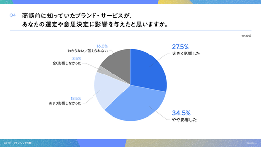 「Q4. 商談前に知っていたブランド・サービスが、あなたの選定や意思決定に影響を与えたと思いますか。」(n=200)と質問したところ、「大きく影響した」が27.5%、「やや影響した」が34.5%という回答となりました。