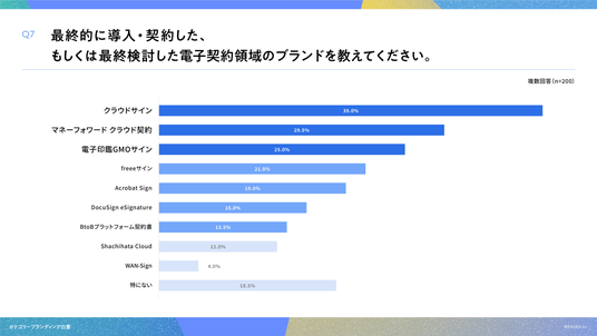 「Q7. 最終的に導入・契約した、もしくは最終検討した電子契約領域のブランドを教えてください。(複数回答)」(n=200)と質問したところ、「クラウドサイン」が39.0%、「マネーフォワード クラウド契約」が29.5%、「電子印鑑GMOサイン」が25.0%という回答となりました。