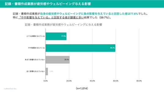 さらに、記録・書類作成業務が「自身の疲労感やウェルビーイングに負の影響を与えている」と回答した者は77.6%に上りました。